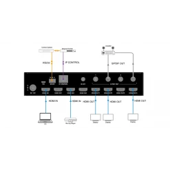 N Simple et Ă©conomique N 4x entrĂ©e HDMI2.0 et 4x sortie HDMI2.0 N Chaque sortie HDMI prend en charge le downconverter 4K vers 1080p avec une rĂ©solution 4K 60Hz 4:4:4 N Conforme Ă la norme HDCP2.2 N Prend en charge les prĂ©rĂ©glages EDID et l’EDID intelligent, chaque entrĂ©e peut ĂŞtre assignĂ©e au mode EDID intelligent. Chaque sortie HDMI dispose d’une prise audio SPDIF. Taille compacte pour une installation et une utilisation faciles. Prise en charge des ports IR, RS-232 et IP pour le contrĂ´le.