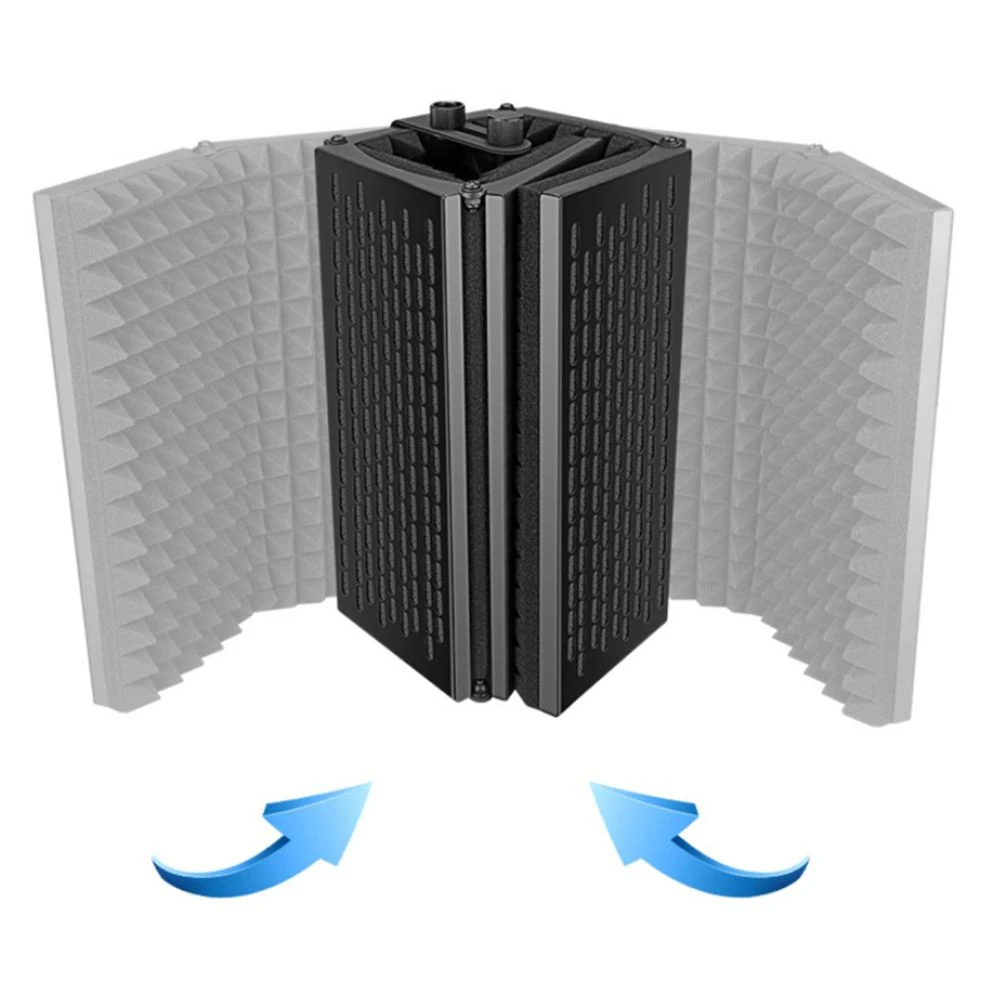 5. Ce bouclier de micro composĂ© de trois panneaux ensemble a deux panneaux pliants et il est libre d’ajuster l’angle et l’angle atteint jusqu’Ă 145 °, il est donc très pratique pour vous d’emporter ce bouclier sonore avec vous oĂą que vous alliez.