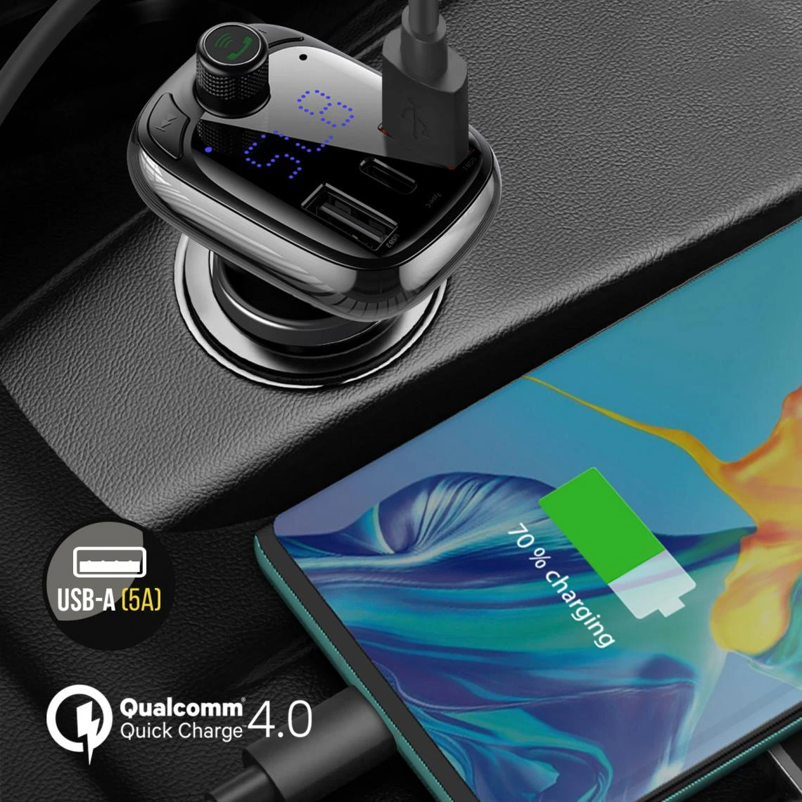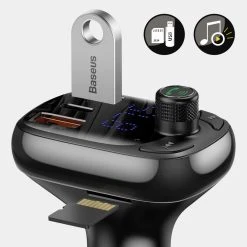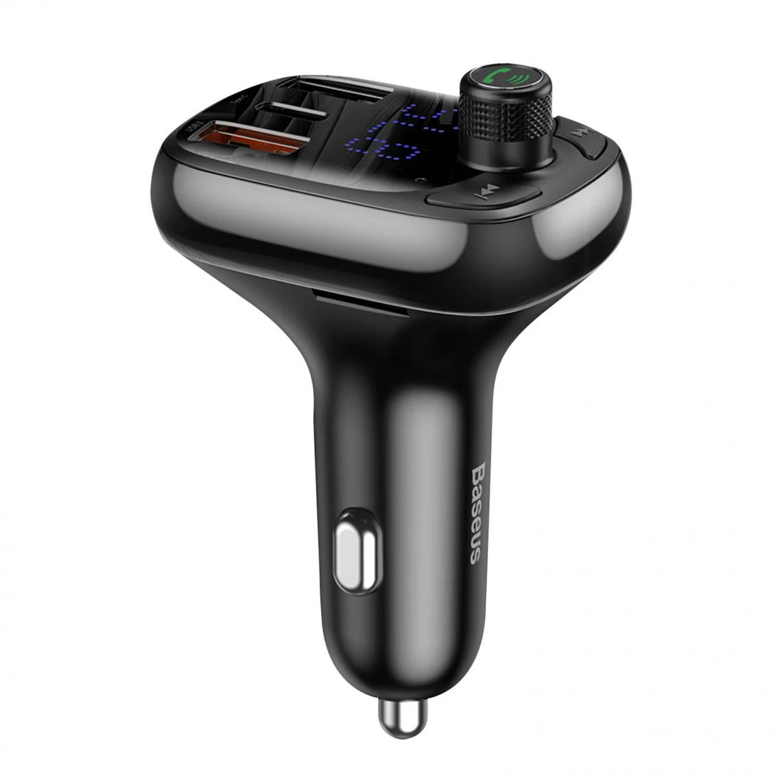 Transmetteur FM / MP3 Bluetooth avec chargeur Baseus S-13. 2 ports USB (charge et audio) et 1 port USB-C. Charge rapide. Connexion Bluetooth 5.0. Entrée Micro-SD. Microphone intégré. Écran LED numérique. Boutons de contrôle et bouton molette intégrés.