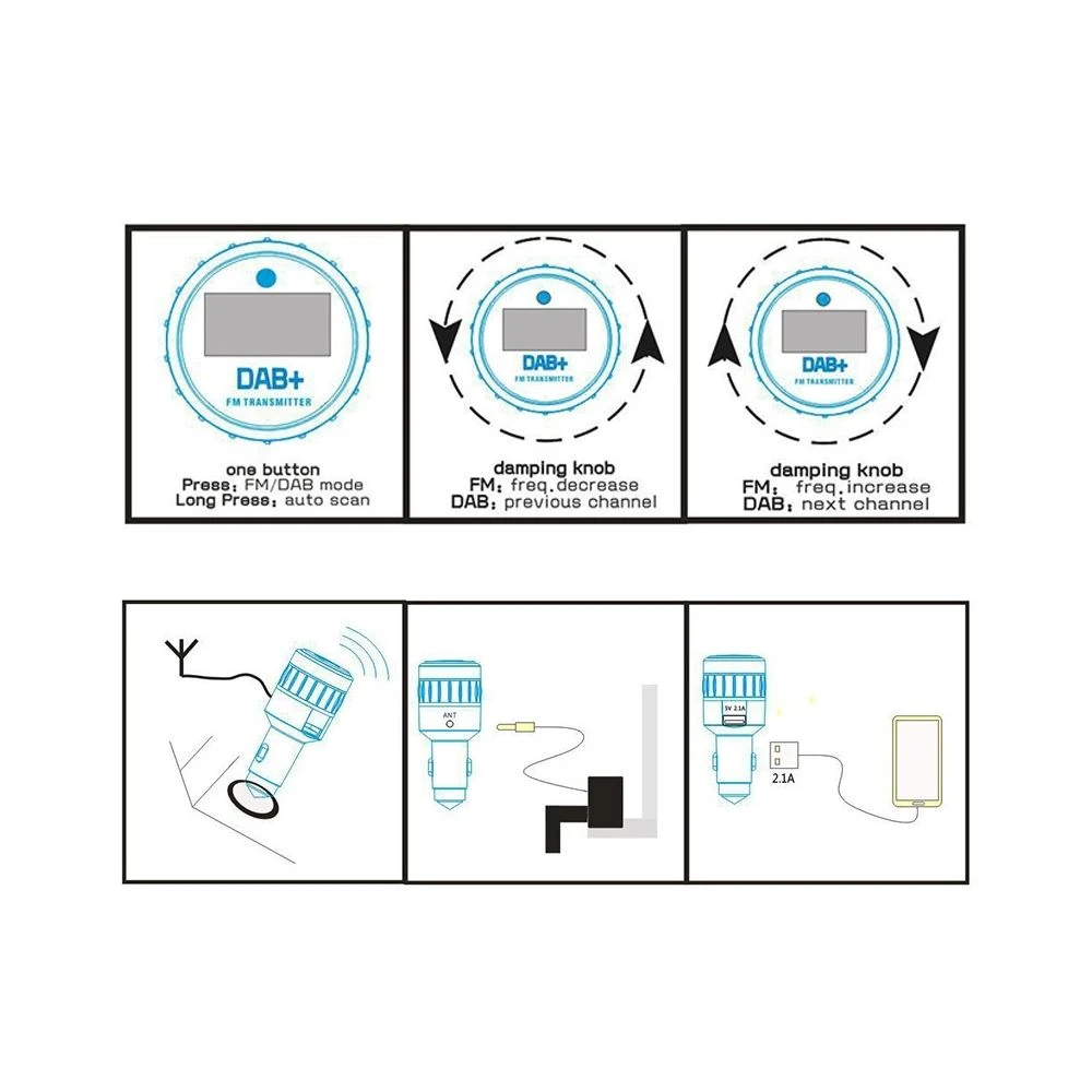 1. Branchez l’allume-cigare en fonctionnement, aucune modification de circuit requise 2. Un seul bouton et un bouton, facile à utiliser 3. Numérisez et stockez automatiquement les programmes 4. Peut afficher le type de programme, l’heure, le nom du canal et d’autres informations 5. Peut afficher puissance du signal 6. Peut charger un téléphone mobile 7. Peut afficher la fréquence de transmission FM 8. Paramètres: Gamme de fréquence de réception DAB: BAND3: 174 ~ 240 MHz Fréquence de transmission FM: 87,5-108 MHz Interface d’entrée d’antenne active 3,5 mm 1,1 pouces Écran OLED Affichage de sortie USB: 5V 2.1A Large tension: entrée 12 ~ 24V, universelle pour grandes et petites voitures